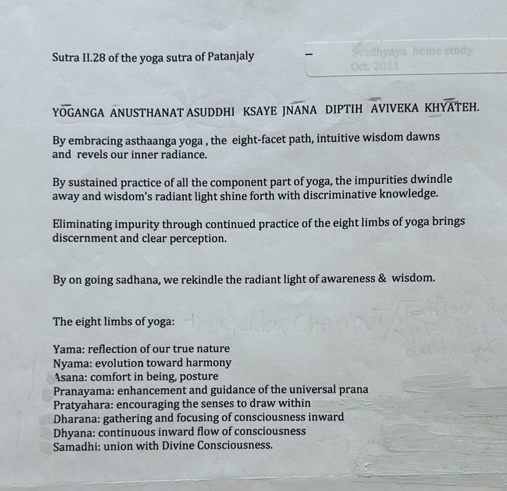 This whole “being human” inspires the desire to support each other in staying strong and trusting in the paths of wisdom of the Yoga Sutras, which guides us in the “eight fold path” focusing on what to cultivate and what to restrain from.
